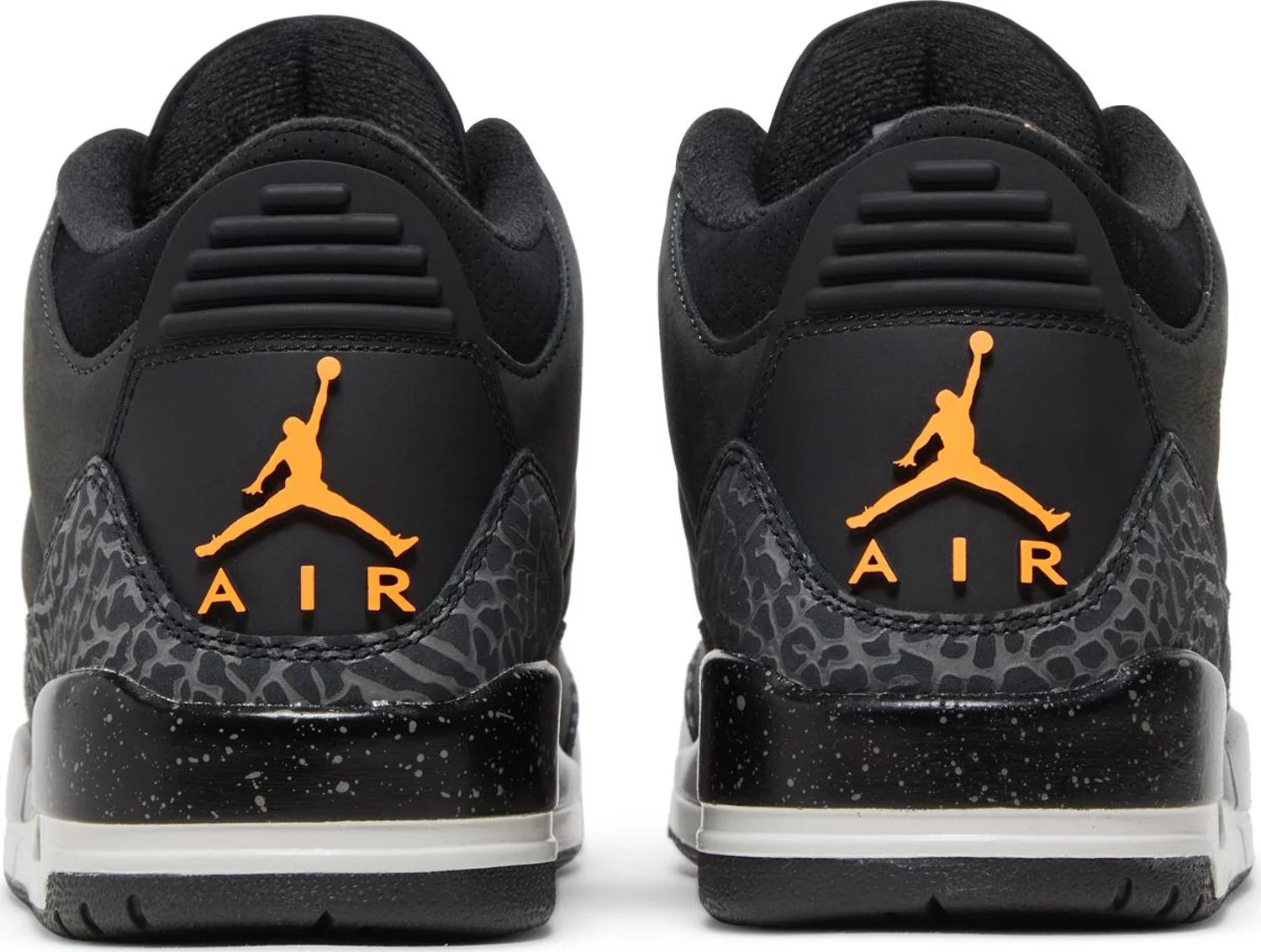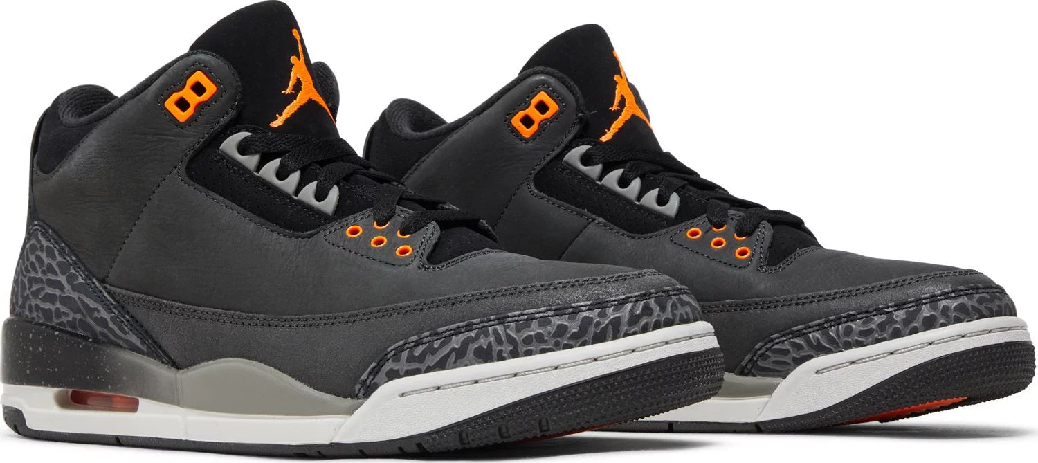 The 2023 edition of the Air Jordan 3 Retro ‘Fear’ brings back a 2013 AJ3 colorway that was originally released alongside an Air Jordan 4 and 5. A dark grey nubuck upper is complemented with tonal elephant print overlays at the forefoot and heel. Black suede is utilized on the collar and tongue, featuring a stitched Jumpman logo in Total Orange. The vibrant color is repeated on the shoe’s eyelets, along with a second Jumpman icon on the back heel. An orange-tinged Air-sole unit adds lightweight cushioning to a tri-tone polyurethane midsole.