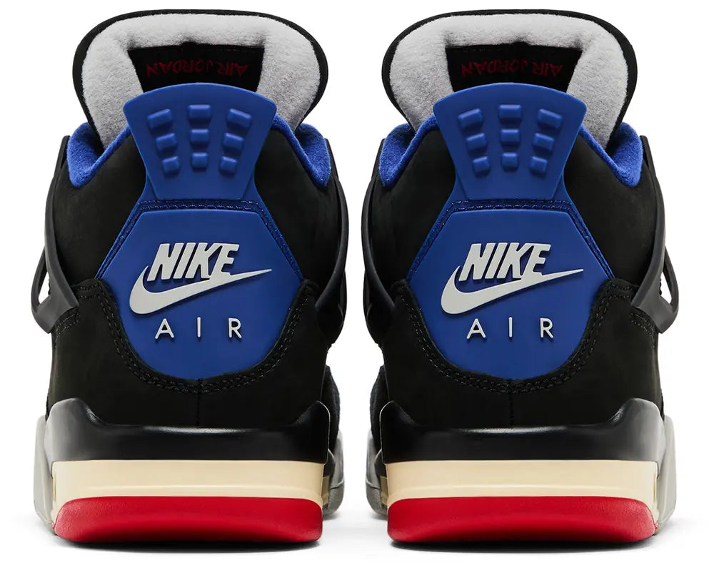 The Air Jordan 4 Retro GS 'Rare Air' features a black nubuck upper with tonal quarter panel netting and TPU support wings. Lower molded eyelets are finished in Fire Red, while the Nike Air heel tab is rendered in Deep Royal Blue, matching the textile collar lining. An inverted Jumpman tag adorns the left tongue, inspired by the imperfections that marred early Jordan samples. The midsole is fitted with Air-sole cushioning in the heel and supported by a rubber outsole underfoot.