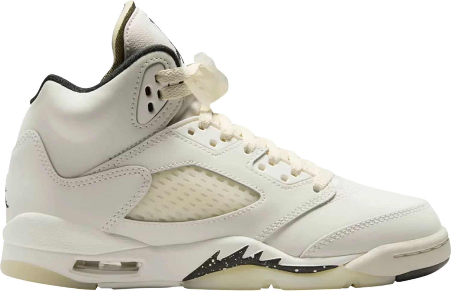 Made for big kids, the Air Jordan 5 Retro SE GS 'Sail' updates the classic silhouette with a chalk white suede upper. The hallmark features of the AJ5 remain intact, including molded TPU eyelets, lace locks, and ventilated quarter panel netting. Exterior branding is limited to an embroidered Jumpman on the back heel and exposed foam tongue. Visible Air-sole cushioning enhances the white foam midsole, accented with speckled black shark tooth detailing. Underfoot, a semi-translucent rubber outsole provides reliable grip.