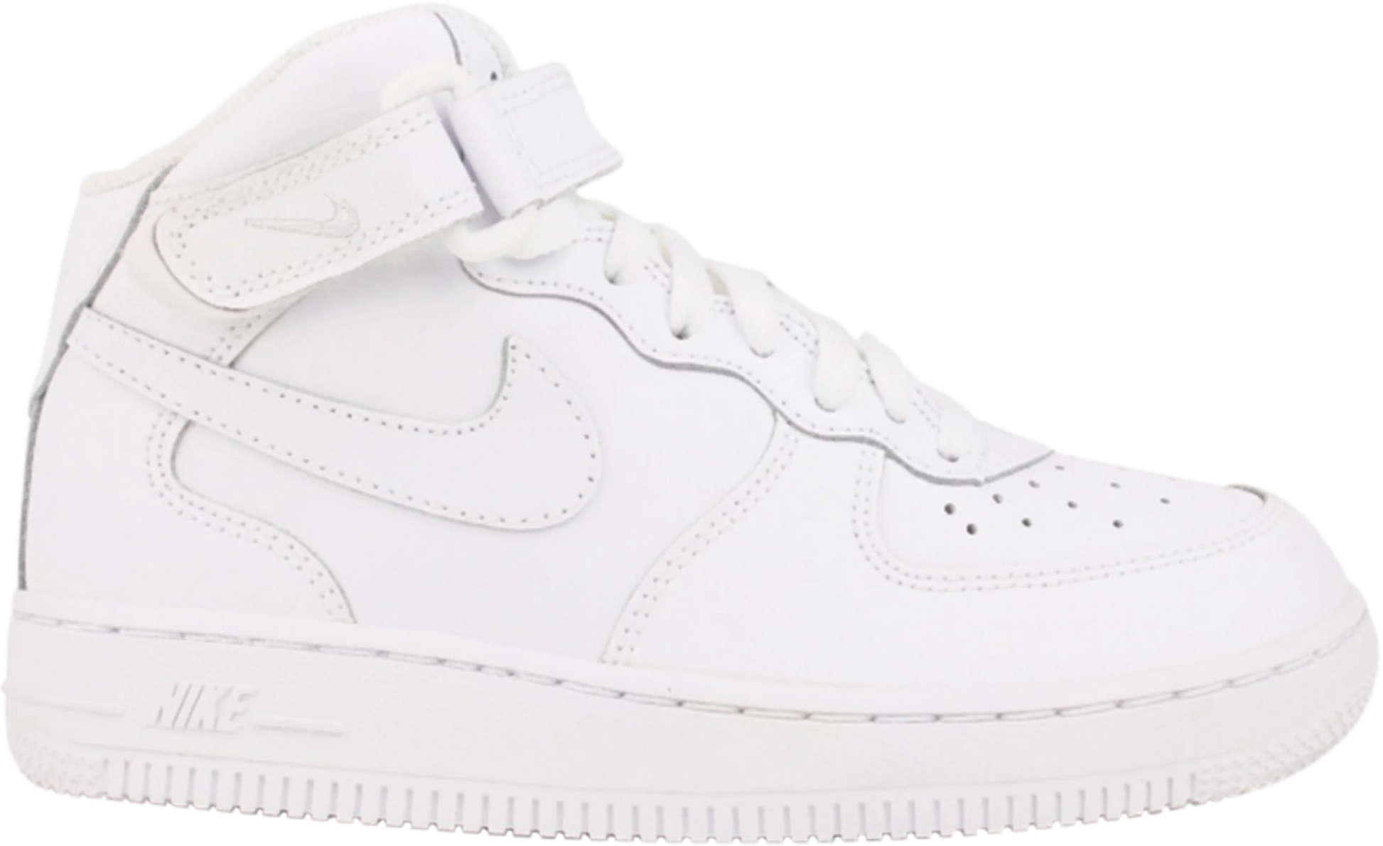 The Nike Air Force 1 Mid PS sneaker brings the iconic silhouette to kids' sizing with an all-white colorway and leather construction. The sneaker features the same standout features as the original: hook-and-loop fastener on the midfoot for a supportive and comfortable fit, foam midsole to provide lightweight cushioning, rubber outsole for durability and traction and springy cushioning with Air Technology.
