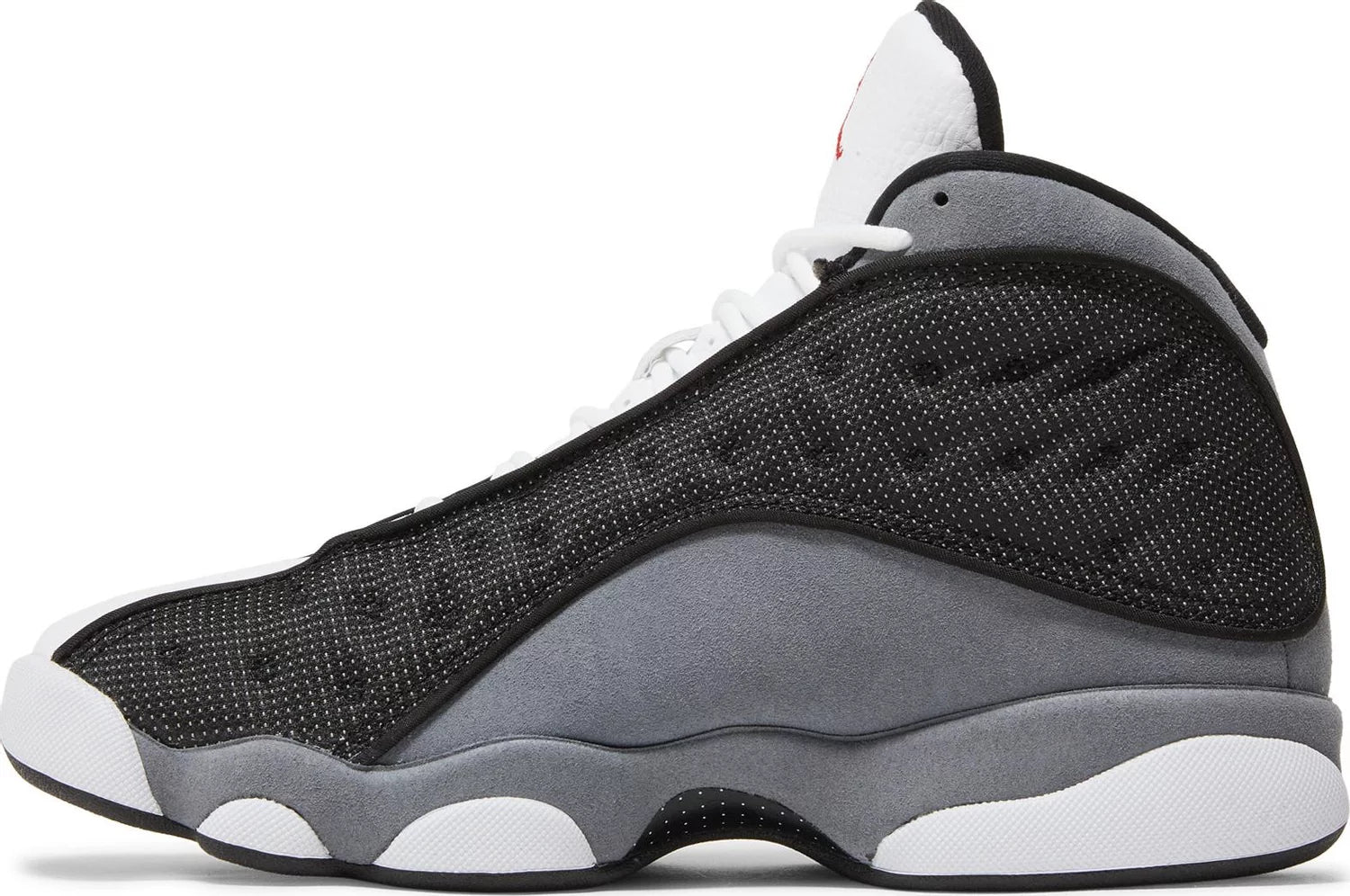 The Air Jordan 13 Retro ‘Black Flint’ dresses the legacy model in OG-inspired color blocking reminiscent of the ‘Flint’ colorway from 1998. Black mesh overlays dominate the upper, featuring a white leather toe box with synthetic grey suede along the midfoot and collar. A crimson Jumpman decorates the white leather tongue, while the 13’s holographic ‘cat eye’ graces the lateral ankle. Anchoring the sneaker is a panther paw outsole, fitted with white herringbone traction pods and an exposed carbon fiber shank plate.