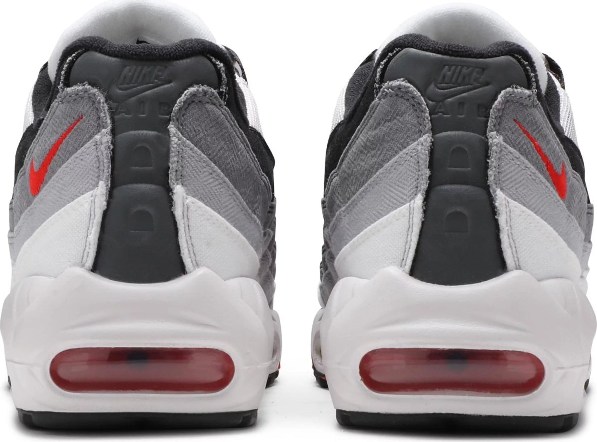 The Nike Air Max 95 QS ‘Japan’ recognizes the country’s influence on American style and culture. The upper is crafted from overlapping layers of textile, highlighted by varying weaves and a gradient color scheme that fades from black to grey to white on the side panels. Webbing eyelets are rendered in Chile Red, while the reflective grey heel panel features a tonal cherry blossom print. The sneaker is mounted on a solid white polyurethane midsole with red-tinged Air-sole units in the forefoot and heel. Underfoot, the rubber outsole is enlivened with the cherry blossom pattern in red and white.