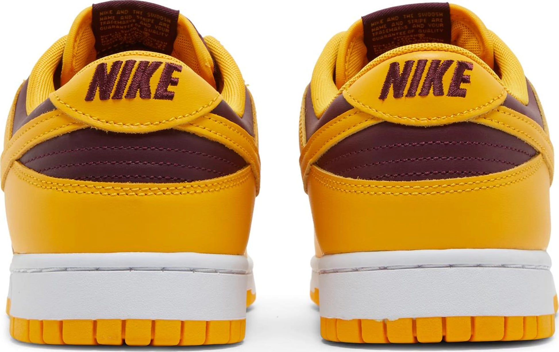 The Nike Dunk Low ‘Arizona State’ dresses the retro silhouette in the signature colors of the Sun Devils. The smooth leather upper pairs a Deep Maroon base with University Gold overlays at the forefoot and heel. The latter hue is repeated on the Swoosh and back tab, featuring a Nike wordmark in embroidered burgundy lettering. Additional Nike branding hits appear on the sockliner and woven tongue tag. The low-top rests on durable cupsole tooling, highlighted by white sidewalls and an amber rubber outsole.